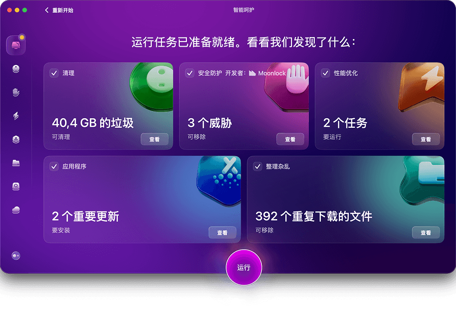 您首先可以使用“智能呵护”模块来优化您的 Mac。这个便捷的模块可以同时运行四个工具,帮助您清理 Mac、更新应用程序、移除潜在的恶意软件威胁,从而大幅提升 Mac 的生产力。