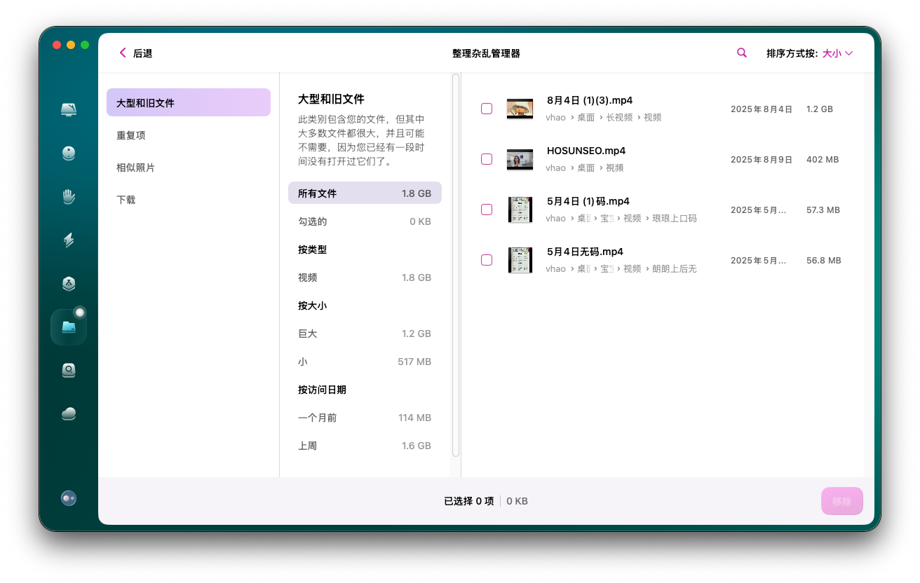 ③ CleanMyMac清理大文件&重复文件:很多人不知道Mac里藏着不少大文件和重复文件,比如重复下载的安装包、过期的电影、重复保存的文档,这些文件手动查找需要按大小排序逐一筛选,耗时耗力。CleanMyMac的“整理杂乱”模块,能自动扫描Mac中的大文件(可自定义大小阈值)和重复文件,按类型分类展示,比如文档、图片、视频等,还会标注文件路径和占用大小,让你精准判断是否需要删除。