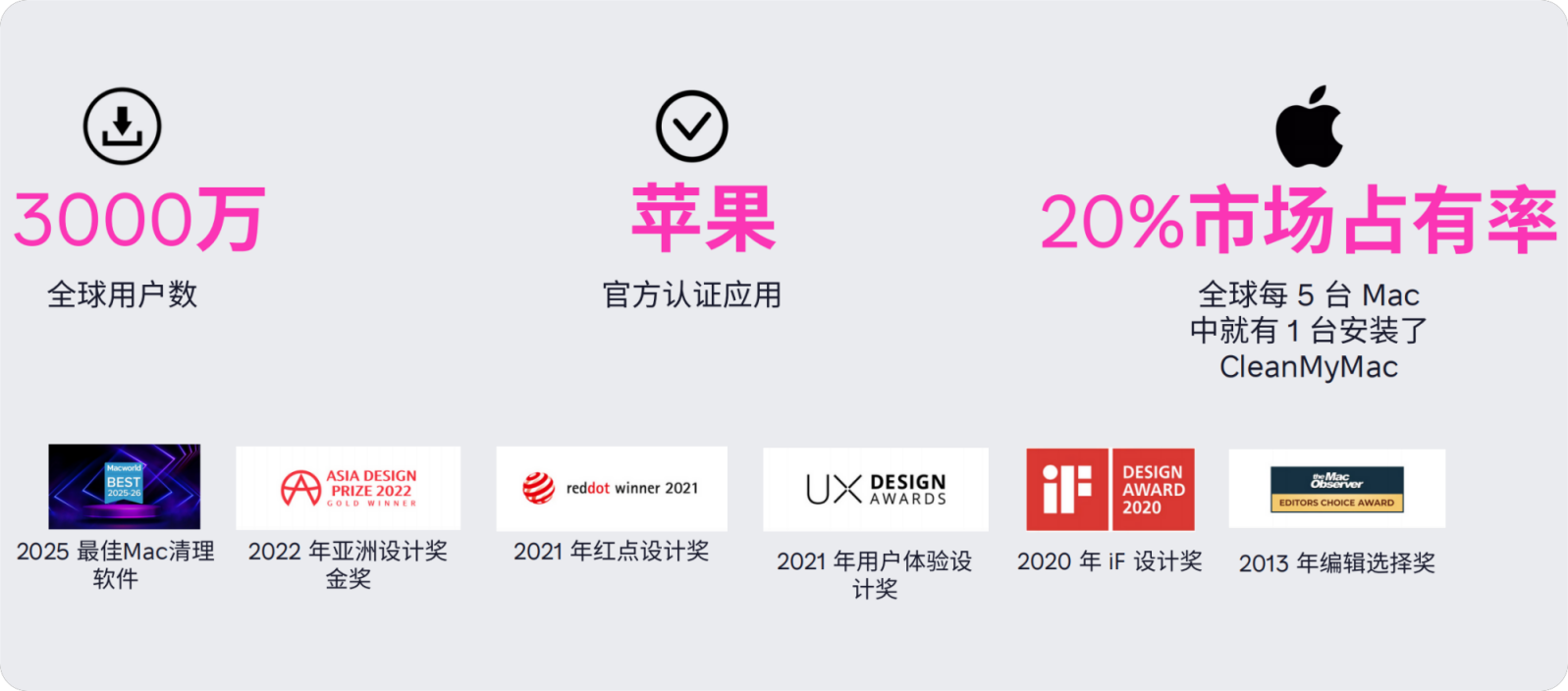 我们的核心理念是:以智能技术预见问题,以简洁操作化解焦虑。通过深度整合的八大模块,CleanMyMac主动为用户管理从存储空间、应用程序到隐私安全的方方面面,将复杂的系统维护转化为一键式的安心体验。这种从“被动修理”到“主动维护”的理念升级,正是CleanMyMac在全球获得超过3000万用户青睐、并赢得苹果官方认证及多项国际设计大奖的根本原因。