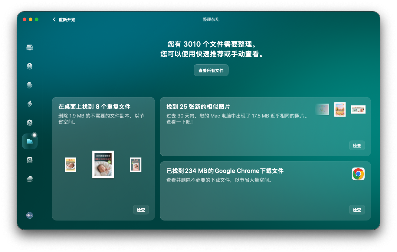 比如它的「整理杂乱」功能,能自动扫描Mac里所有的重复文件,不管是重复的文档、图片还是视频,都能精准识别,我们可以一键删除冗余的重复文件,释放磁盘空间,也避免了重复文件占用智能文件夹的显示空间,让mac文件管理更整洁。另外,它的「大文件和旧文件」功能,能快速找到占用空间较大的文件和长时间未使用的旧文件,这些文件很多都是我们遗忘的冗余文件,删除后能进一步优化Mac的储存空间。