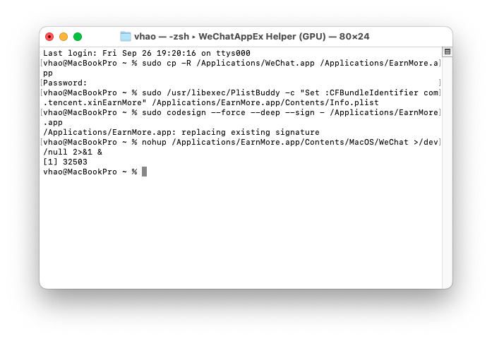 解读:这条命令的作用是,将系统应用程序目录下的原始微信应用(WeChat.app)完整地复制一份,并重命名为“EarnMore.app”。sudo意味着需要管理员权限。