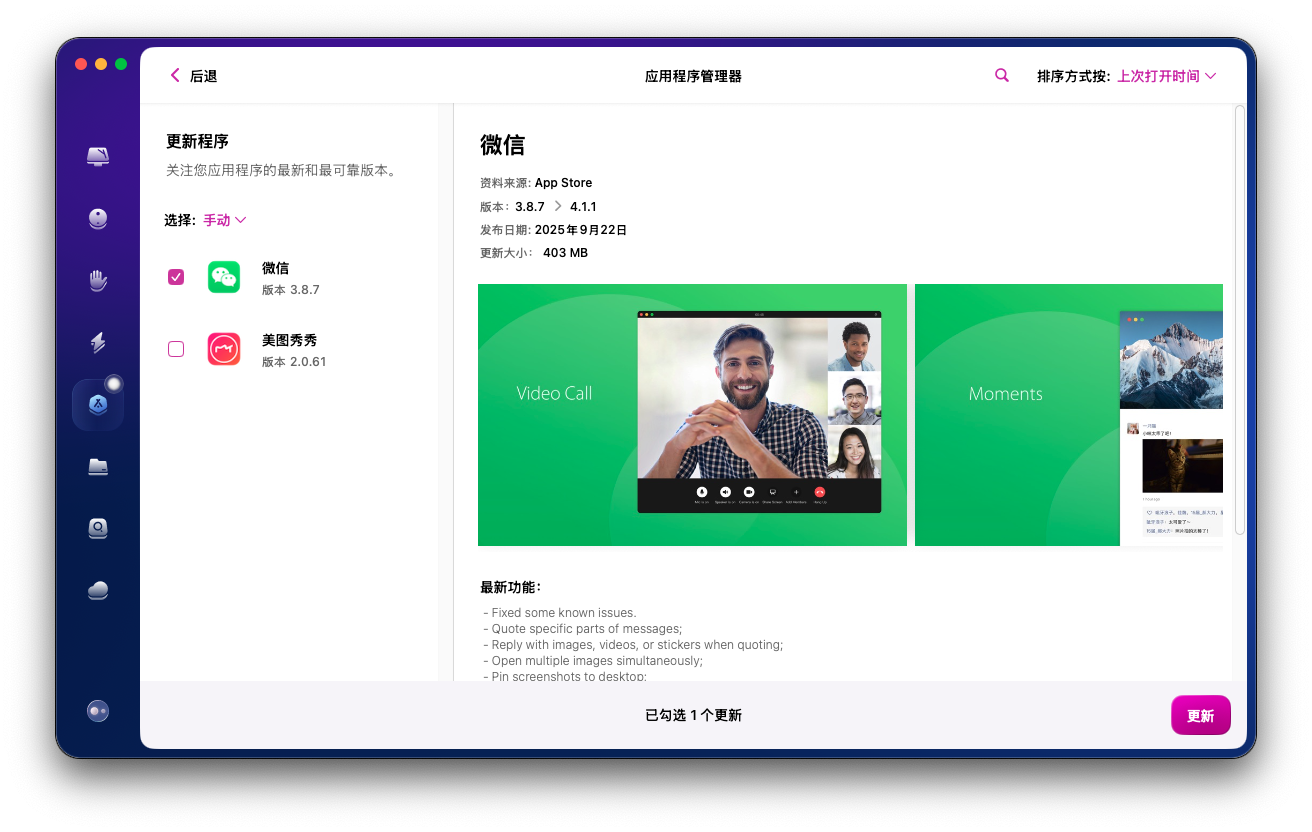 - 管理应用:如果你后续想卸载这个微信分身,CleanMyMac的“应用程序”功能可以将其彻底清除,不留任何残留。