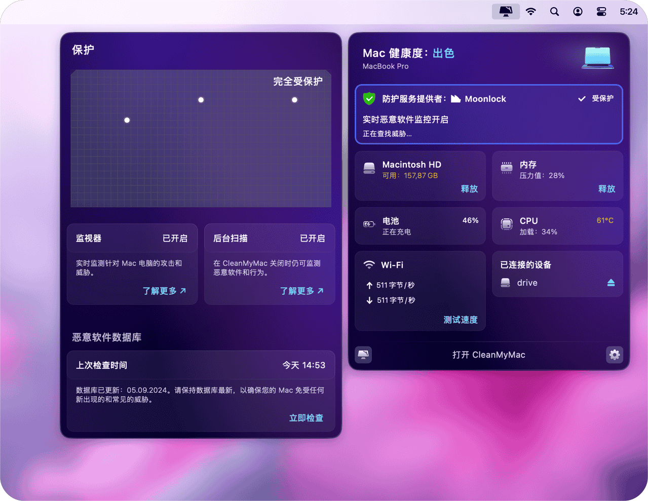 CleanMyMac或许在许多人印象中是一款强大的系统清理工具,而非Mac杀毒软件。但它的“菜单”模块下的安全防护功能已经进化得十分成熟和可靠,使其成为一款集安全、清理、优化于一身的全能型选手。