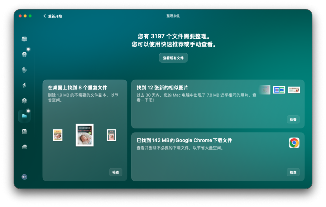 使用CleanMyMac的"整理杂乱"功能,你可以直观地看到哪些文件占用了大量空间,轻松管理截图文件。这对于经常使用mac截屏快捷键的用户来说尤其有用,可以避免磁盘空间被大量截图文件占用。