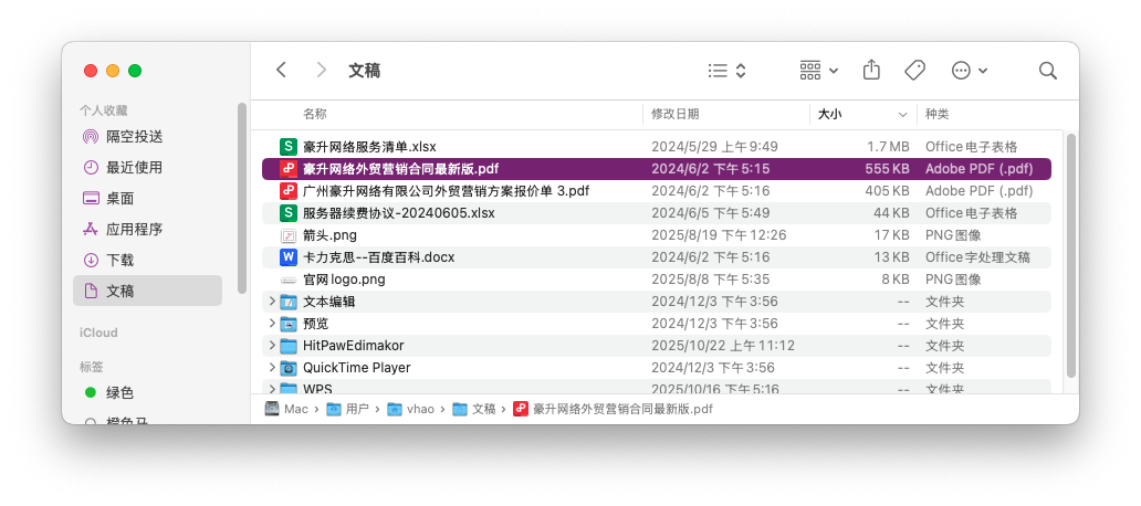 我举个例子:比如我在Finder里打开了一个“工作文档”文件夹里的文件,按下Option+Cmd+P后,底部会显示“Macintosh HD-用户-我的文档-工作文档”,点击路径上的任意一个文件夹,就能直接跳转到该文件夹,再也不用在左侧边栏里反复查找了。对于经常需要整理大量文件的人来说,这个快捷键简直是救星。