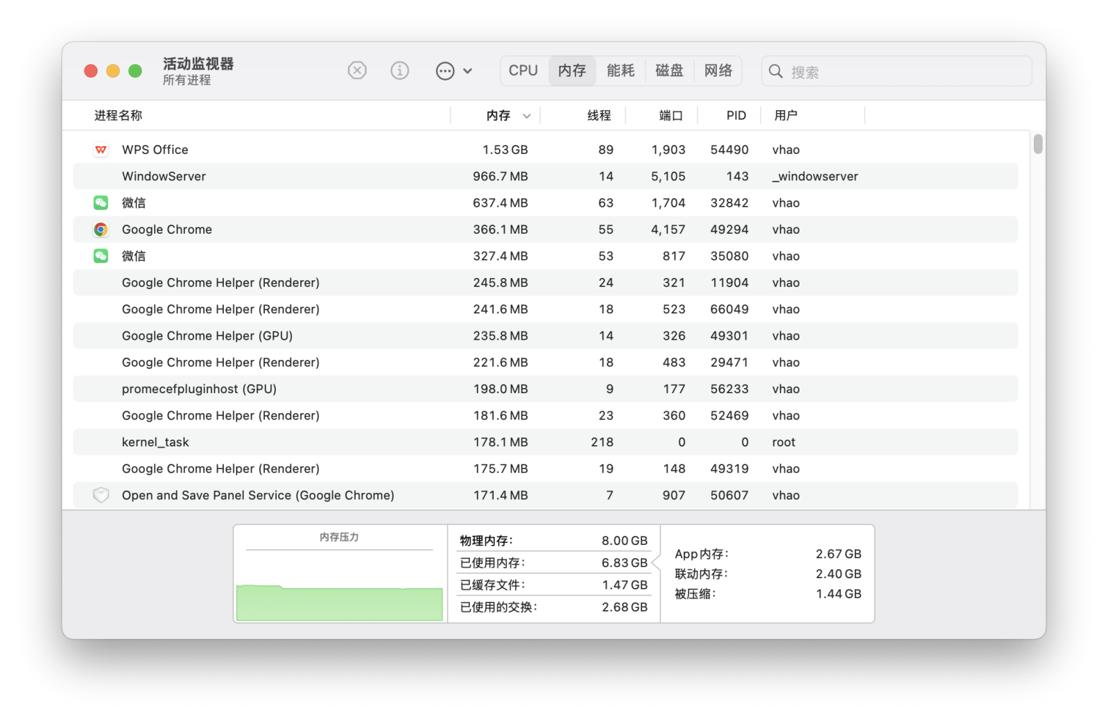 打开"应用程序→实用工具→活动监视器",切换到"内存"标签页: