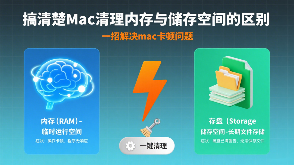 要解决Mac卡顿问题,必须首先理解内存(RAM)和储存空间(SSD)的核心差异。许多用户将mac清理内存与mac清理储存空间混为一谈,这是导致优化无效的根本原因。