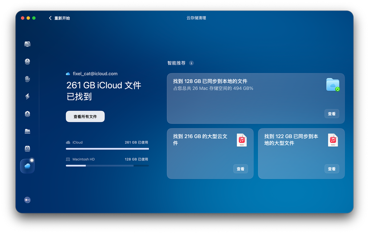 打开CleanMyMac的“云存储清理”功能,它会自动扫描Mac上的iCloud云盘同步文件、照片缓存、邮件附件等冗余内容,分类清晰,我们可以根据自己的需求选择清理。