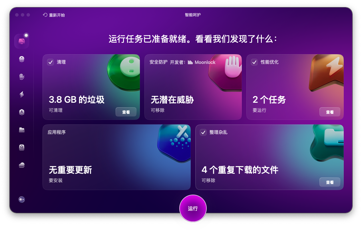 打开CleanMyMac后,首页的“智能呵护”会自动检测macOS26的5大问题:系统垃圾、性能优化、安全隐患、应用程序残留、重复文件。我实测扫描自己的Mac,发现了3.8G可垃圾,2个可关闭的后台进程,4个重复文件。点击“运行”后,软件会自动完成关闭进程、删除垃圾、优化启动项的全流程,不到2分钟就搞定,比手动操作快10倍。