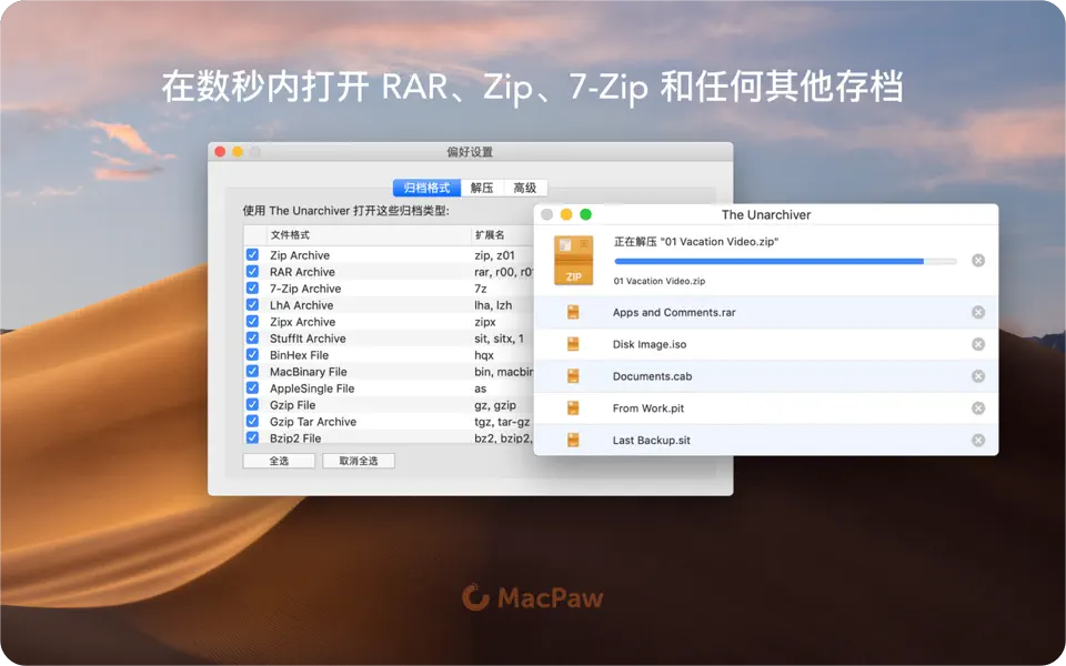 MacBook Neo自带的解压工具功能单一,不支持RAR、7Z、分卷压缩包等常见格式,解压中文文件名还容易乱码,日常下载文件、接收压缩包根本没法用。The Unarchiver是Mac平台口碑最好的免费解压软件,完美适配MacBook Neo,支持市面上所有压缩格式,解压速度快,不占内存,中文文件名解压零乱码,操作简单无广告。