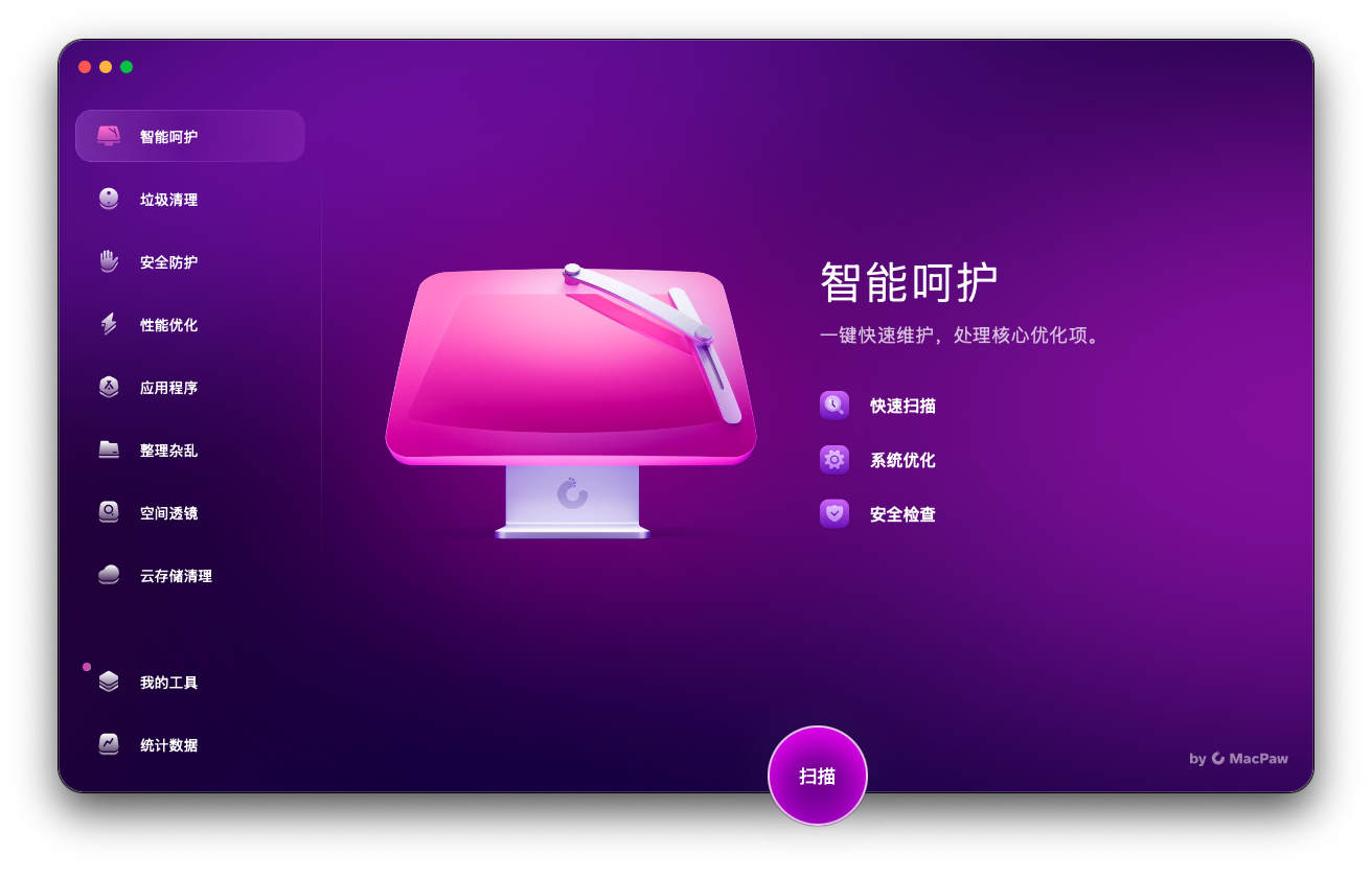 在Mac系统维护工具中,CleanMyMac是经过市场长期验证的产品。它由MacPaw开发,不只是单一清理工具,还整合了系统清理、性能优化、安全防护、应用管理、重复文件处理等多项实用功能,能够帮助新手快速解决Mac卡顿、存储空间不足、应用残留等常见问题,操作界面简洁,适合大量新增的入门级用户。