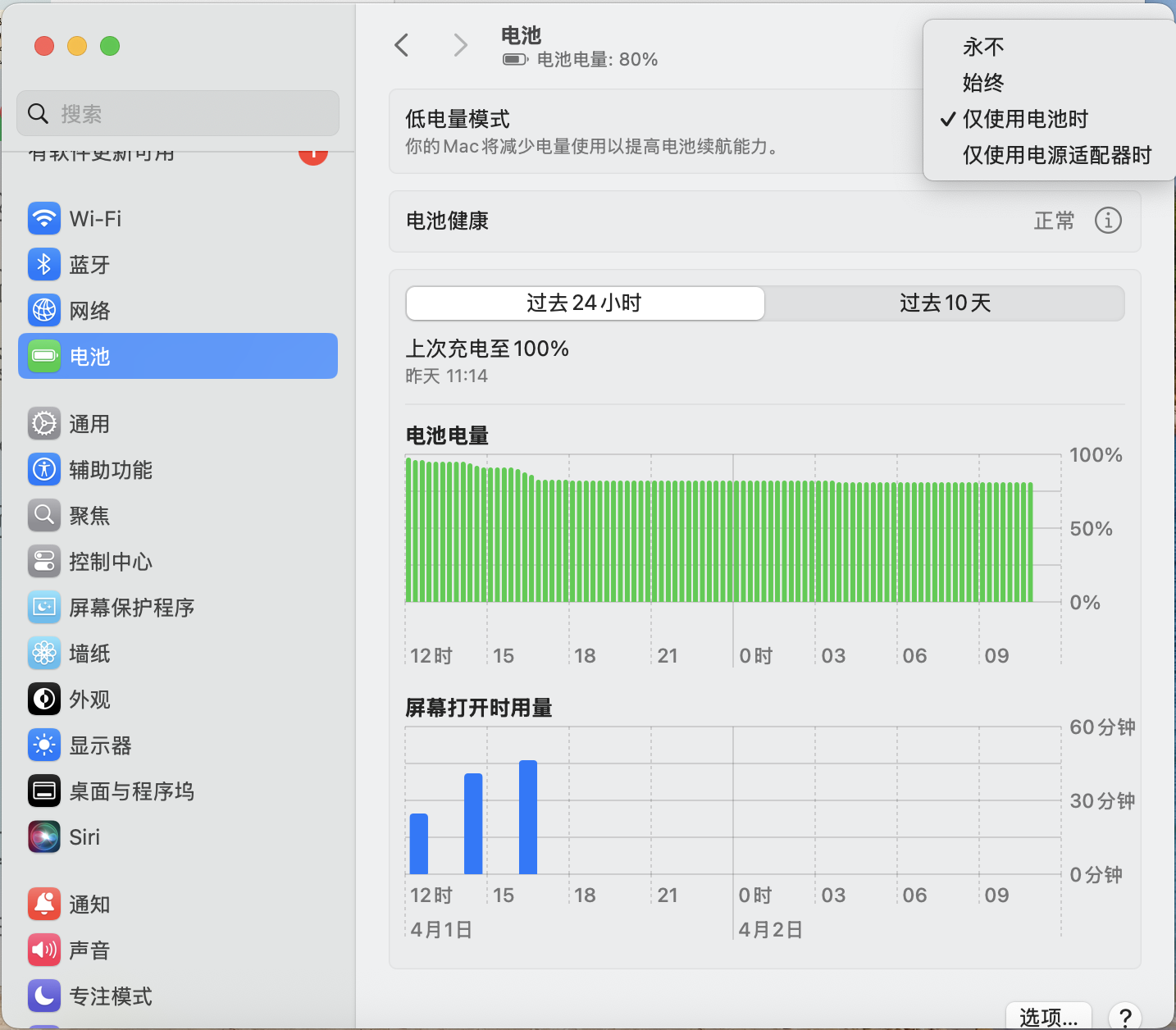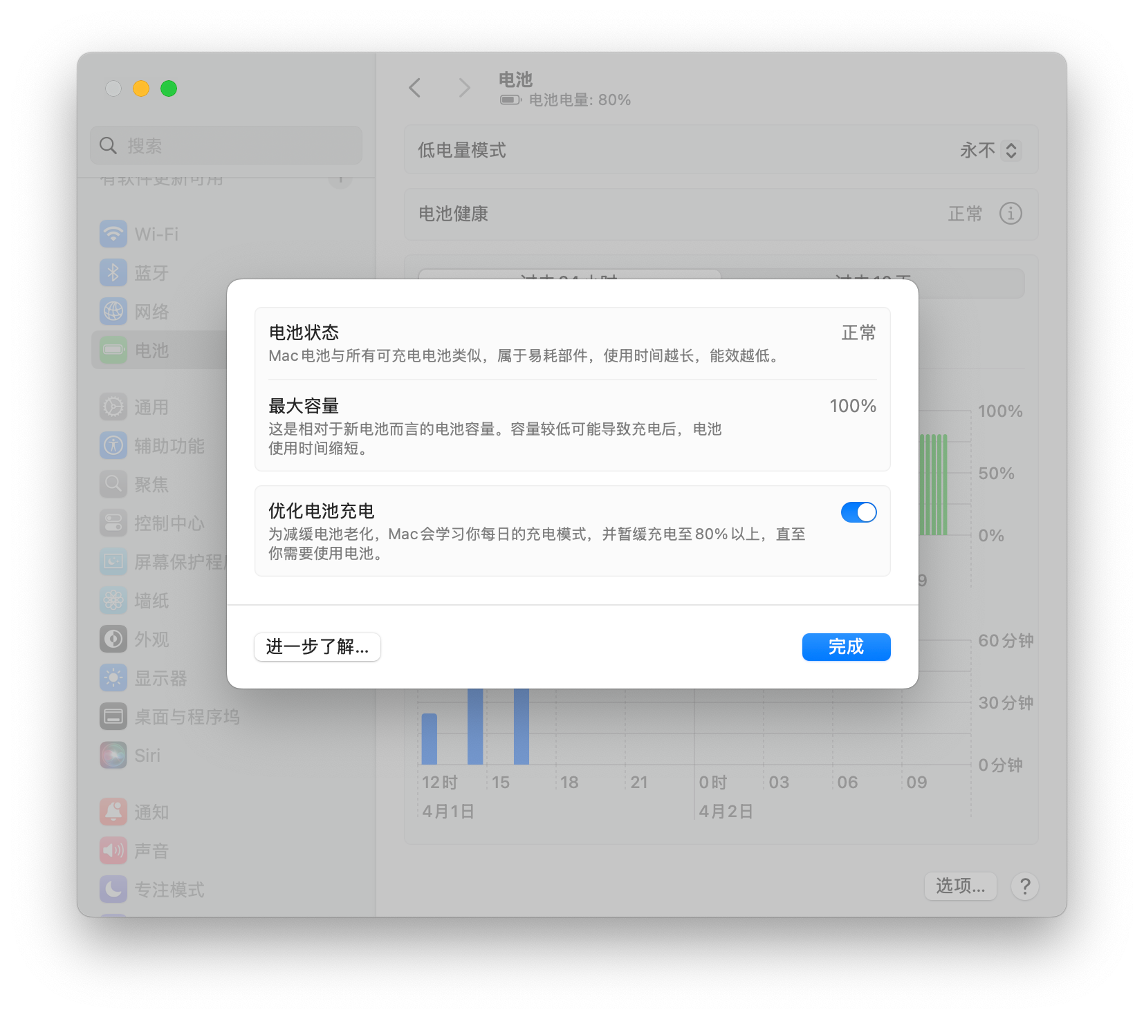 实操设置:打开MacBook Neo的【系统设置】→找到【电池】→勾选【优化电池充电】。开启后,MacBook Neo会学习你的日常充电习惯,充电到80%后自动暂停,等到你需要使用前再充满,避免电池长时间满电滞留。哪怕经常插电使用,这个设置也能大幅延缓电池健康度下滑,坚持用,MacBook Neo电池健康度1年仍能保持95%以上。