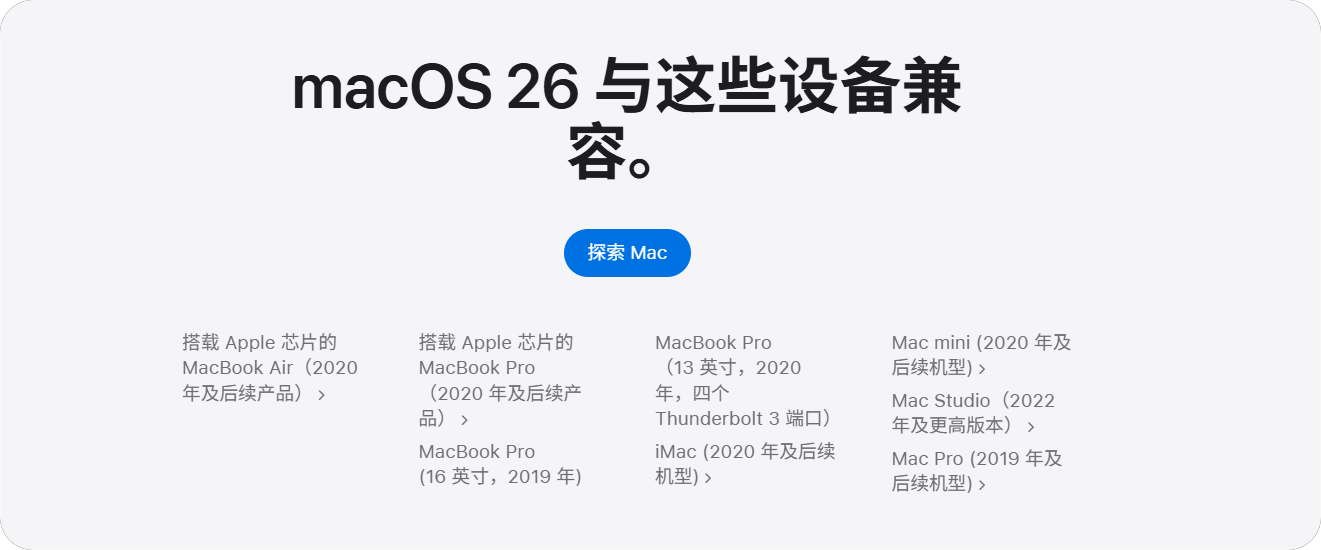 苹果明确列出了支持Mac升级macOS26的机型:2020年及后续的Apple芯片Mac、2019款16英寸英特尔MacBook Pro等是“幸运儿”,但2019年前的英特尔iMac、2018款Mac mini已被淘汰。老款机可在“系统设置-通用-软件更新”里查看适配提示,确认能升级再动手,避免白忙活。