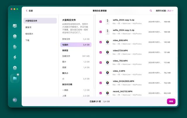 我们的智能技术可以精准地查找出那些长期被遗忘的大文件,例如旧的视频或压缩文件,它们不必要地占用了宝贵的存储空间。这让 CleanMyMac 在众多 Mac 清理工具中脱颖而出。